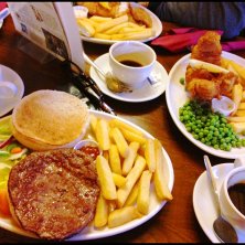 ポートベロの蚤の市で。 ダイナー。 豆がなかったらしく、グリンピースに。 お肉はビーフでかため。