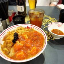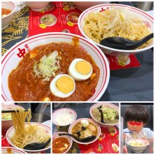 家族で蒙古タンメン中本へ突撃🀄️ 本店はテーブル席があるので週末になると家族連れ多め 息子:塩タンメン(辛さ0) 妻:レディースセット※味噌タンメン(辛さ3) 私:つけ樺太※麺大盛り(辛さ10) +半ライス 限定の『つけ樺太』は冷やし味噌のスープに樺太丼の樺太麻婆が乗ったもの 見た目通りドロドロだから麺をつけるというより絡めてすすれば辛味と旨味が口内フィーバー ラストはオンザライスで麻婆丼に変形しちゃって完食完飲 息子の塩タンメンも半分食べたから超絶腹パンww ごちそうさまでした