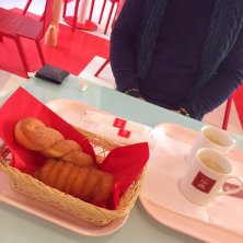 おはようございます! 朝ご飯はちゃんと食べましたーヾ(´ー`)ノ♪ 朝食バイキングをしっかりとw それなのにここのパンは別腹なのですwww パパがマフラーを喜んでつけてます(*´艸`)♡