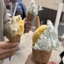 しまなみ海道サイクリングの途中で立ち寄った、生口島にある有名なジェラート屋さん、ドルチェ。 左が私の注文したレモン味、右が彼氏の注文したオレンジ味。 オレンジの方が美味しかったーーー!(笑)