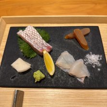 鯛、ヒラメ、カラスミ、大根千枚漬け