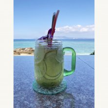 キウイとパッションフルーツのジュース。とても爽やかで美味しい。 紅いもタルトで有名なお菓子御殿の地下2階のカフェ。目の前の沖縄ブルーのきれいな海を見ながらまったり。平日だからかすいてるし、穴場かも。とってものんびりできます(^^)