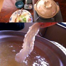 越前蟹の中でも小型底引き網漁で獲れた、黄色いプレミアムタグの付いた蟹だけを扱う店。 直接港に出向いて仕入れた蟹は生で食べられるくらい新鮮なので「越前蟹鍋」の濃厚スープで軽くしゃぶしゃぶでいただく。