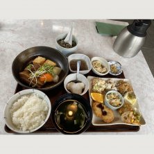 サクサク揚げ湯葉のせ冷めん定食 組み上げ湯葉 白和え 生湯葉と鶏肉としぶりのとろみ煮 さつまいもコロッケ ピーナッツ豆腐 湯葉ふりかけ ごはん 盛りだくさんの定食!