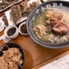 沖縄旅行最終日の昼食は、 奥武島手前にある、もずくそばの店くんなとぅさん もずくソーキそば定食 柔らかなソーキにもずくそば美味い😋 もずくの天ぷらもgood👍 もずくづくしの定食大満足でした💯 ご馳走さまです🙇♂️
