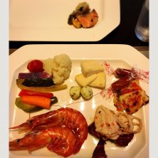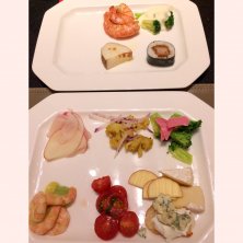 晩御飯のブュッフェ 先ずは一の膳…笑笑 手前から… 海老とアボカドのサラダ🦐🥑 ミニトマトの青紫蘇マリネ チーズ盛り合わせ🧀 ブロッコリーとハムのサラダ🥗 カリフラワーのインディアン(カレー炒め?) 赤かぶの千枚漬け 奥の皿… ブロッコリーとカブのチーズフォンデュ 大正海老のアヒージョ 長芋のオイル焼き カツ巻き