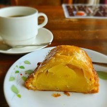 曇り空、県境湖畔のカフェへ。名物の「手作りアップルパイ」600円と「コーヒー」450円!しっとりサクサクでリンゴ感ハンパないです。