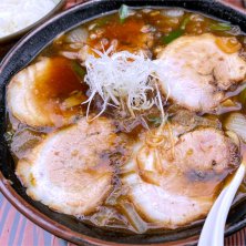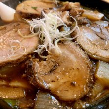 千葉三大ラーメンの一つ アリランラーメン アリランチャーシューをいただきました😃 独自の調理方法により、玉ねぎをベースに 炒めた豚肉・ニンニク・ニラ・ネギを使用したピリ辛仕様とのアナウンス🙄 竹岡式のチャーシュー煮汁の苦旨味と炒めた玉ねぎの甘みとラー油の辛味、ニラ、大蒜の香味野菜のパンチ力と云ったところか。 麺は加水率の高めな中太自家製麺 丁寧な出来の煮豚バラロールチャーシュー スープとの親和性も良し。
