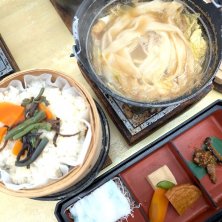 今日は牛角の懸賞の日帰りバス旅行に来ています。 やっとお昼にありつきました。 サラダおざらと山菜おこわに野菜と豚肉の重ね蒸し、しいたけ味噌にペラッペラの天ぷら(笑) ただなので文句も言えませんが(-_-;)