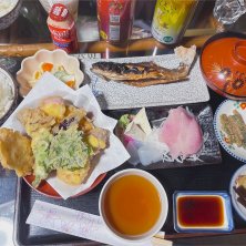 合掌造りの民宿五ヨ門の夕ご飯。 鮎の焼き魚や季節の天ぷら、鯉のお造りなど 宿泊に夕飯込みはありがたい