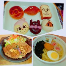51m14d 幼児食 ブランチ 昨日もはしゃいで疲れたのとホテルの大きな窓には完全遮光のロールカーテンが付いていたので8時過ぎまでお寝坊さん ゆっくり支度をしてアンパンマンミュージアムへ タクシーの運転手さんもビックリな人の列 笑 とりあえず我が家はパン屋さんの開店を待ってフードコートでゆっくりブランチ 娘ちゃんは色んなパンを少しずつ食べたい!とのリクエスト いつもはそんなことさせないけれど アンパンマン 食パンマン バイキンマン ドキンちゃん あかちゃんマン フランク ↓