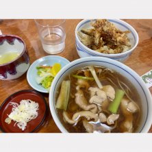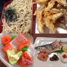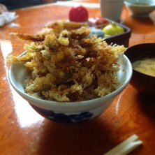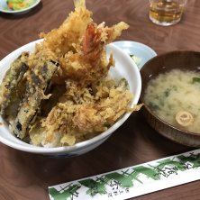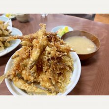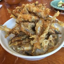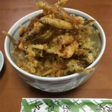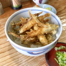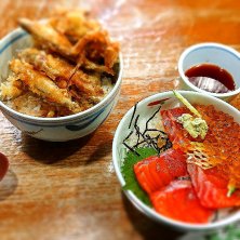 ワカサギ天丼とマスのイクラ丼。お刺身は一切れ食べちゃった画像です。それぞれハーフサイズで頂きました。サクサク食感で淡白な味のワカサギの天ぷらが最高でした( •̀ᄇ• ́)ﻭ✧