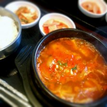 おそとランチ♬ とっても寒い日なので豆腐チゲで温まりました(*'▽'*) グツグツ*あっちっち!! たっぷりのお豆腐*プルプル牛すじ*たまご*お餅入り~♡♡ ********** ☆豆腐チゲスープ