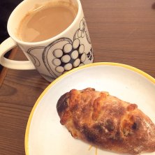 私の朝ごはん サマーシュのあんぱん スープ 黒豆ヨーグルト 柿 ハード系あんぱん美味しい◟(๑•͈ᴗ•͈)◞