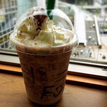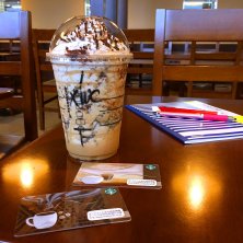 【チョコレート クランチ フラペチーノ・グランデ】 *addショット *exホイップ 久しぶりの朝フラペは、今日からの季節限定品〜♪ (๑◕ˇڡˇ◕๑) 初モノなんでシンプルに、ショット追加とホイップ多めだけにしといた! ついでにアロマとメルトのスタバカードもゲット〜♪(≧∇≦)