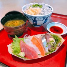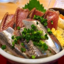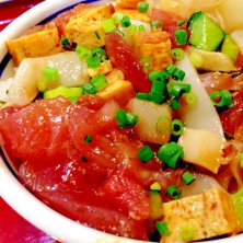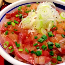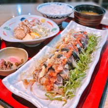 <鰹のっけ盛りと唐揚げ定食 ¥1,100(税込)> カツオは脂がのった戻り鰹より 脂がない赤身でスキッとした味わいの初鰹が好みです。今の時期はまだ初鰹に近く、ポン酢と薬味でさらにサッパリとして、美味〜い♫