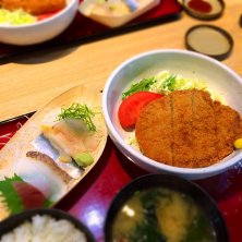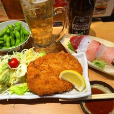 ランチはボリュームに定評の店で、マグロメンチと刺身の定食。 天気いいし、新宿御苑沿いのオープンテラスの店で桜でも見ながら、なんてのは同僚たちから却下! 大食漢どもめ(>_<)