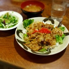今日は浦和市内で会議〜。 会場傍のisle(アイル)さんにて、もち豚バラ肉のスタミナ丼セット 800円(ドリンク付)をいただいてます♪