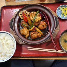 築地食堂 源ちゃんで若鶏と根菜の黒酢炒め定食をいただきます。