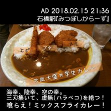 砂の嵐に隠されたオンボロ荘に住んでいる、妄想力おじさん、バビル花隈です。 バビルだけど、大阪のあの有名店に非ず! こちら石橋商店街のカツ専門店! かつれつ亭のミックスフライカレー(大盛)にて候! 普通盛りでも、割りとデカイ。 さすが大阪大学お膝元。 学生たちに、腹一杯に食べさせたいオカン気質なお店が商店街には多くて多くて、これが世に言う袋小路かと…(違います) サラサラあっさり系のカレーは、まるで串カツのタレのよう。フライの衣によく馴染む。この皿の主役はカレーじゃないな。カツうめぇ~!!