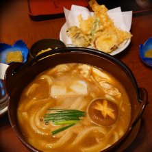 味噌煮込みうどん天ぷら付き。甘めで美味しかった。雪の日で庭に15センチ積もってる日だったから、温まってちょうど良かった。さすがにお客さんは我々以外はいなかった。
