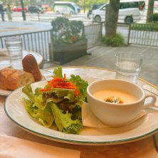 MENU B のランチは選べるメインとデザートとドリンク 前菜のパテ・ド・カンパーニュ メインの鶏モモ肉のスパイス煮込み デザートのチョコレート・ムースとアイス・カフェオレ どれもボリュームたっぷりで、完食すると男性でもお腹いっぱいになれると思います。 これからの季節、路面のテーブル席も気持ちよさそうですね。 (まあ、真夏でも外のテーブルで食べてる元気な方々も大勢いらっしゃいましたが)