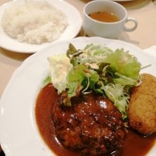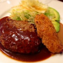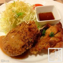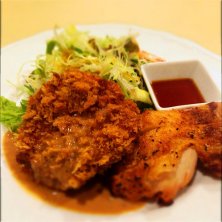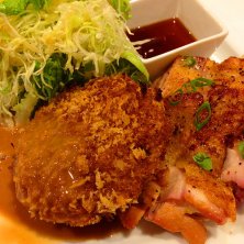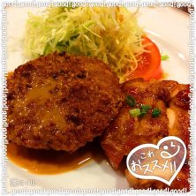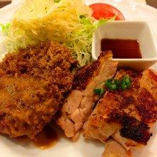 日替りランチ。メンチカツ、チキンのオーブン焼き(やきとり風味)。 チキンは皮はパリパリ、中身はジューシー。