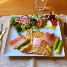 ガレットが食べたくて、お一人様でカフェに来ています。優雅ですわ(*´ω`*) ガレットちっちゃくて足りん・・(笑) ガレットもアスパラも炭焼き感があり香ばしく、味はとても美味しい。 店内床暖房なところに驚き。専用の毛糸のようなスリッパに履き替えて入店しました。 店員さんが話しかけてくれて良いお店。次はカウンター席でって^^ また来ようと思います。