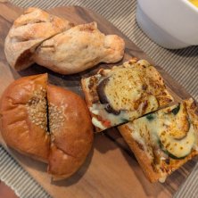 栗とカシューナッツのバトンは、栗がゴロゴロ入ってて贅沢♡ ストロベリー&クランベリーのレアチーズのデニッシュは、上のピンク色の渦巻きが、メレンゲかと思いきや、プニプニしたクリームで美味しい\(•ㅂ•)/ 焼きカレーパンは、カリッと焼かれたハード系のパンの中に、美味しい欧風カレーが入っていて、実に実に美味!今まで一番美味しかったカレーパンかも! そしてイートインしてる間にも、奥のキッチンで次々とパンが焼かれて、焼きたてが売り場に( 'Θ')ノ☆