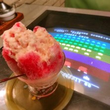 母と熱海へ日帰り温泉に来てます♪湯船から海を眺めてゆっくりしたあとは喫茶店で甘いものを♡ 懐かしのプリンアラモード‼︎インベーダーゲームのテーブルで昭和感満載です☻こういう雰囲気好き〜( ›◡ु‹ )