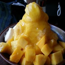 山盛りのサラサラのカキ氷にたっぷりのマンゴージャムを掛けて、マンゴー2個を盛り付けた 、とても贅沢なデザート。口の中で、蕩けます。