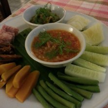 伝統的な、タイ料理の前菜。ナームプリックオーンを漬けて、野菜などを頂きます。