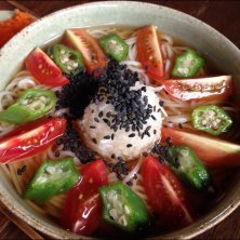 今日は、さっぱりランチ。トマトとオクラの冷たい冷麦。大根おろしに黒ゴマが綺麗にトッピング。山盛りの、生姜と青ネギ、人参まで付いてます。