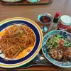フレンチトーストモーニング。 厚切りレーズンパンをフレンチトーストにして、チーズ、バナナ、ブルーベリージャムをのせて。 サラダバー、ドリンク付き。600円。 小夏ドレッシングでさっぱり味のサラダ。 プチデザートでバームクーヘン。生姜味!
