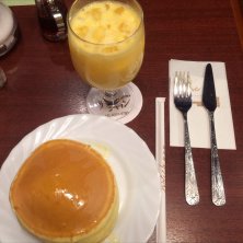 ホットケーキセット。ミックスジュースで。懐かしい味でした。ジュースは果物そのものの味がしっかりして美味しかったです。