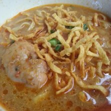 今日のお昼も、カオソーイです。チェンマイ大学から少し離れた住宅街に有ります。 クリーミーなカレースープで、鶏肉は骨付きモモ肉のぶつ切りと胸肉の2種類。昨日より、カレーが強くクリーミーで、後味良しです
