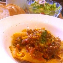 おすすめ定食 子羊のラグーソースペンネ ひつじ家らしくラム使ったで。 実は、これに豆とカレースパイス入れたらいつものカレーなんだけどw バゲットは近くのパン屋さんクスパンさんで買ってきてます。