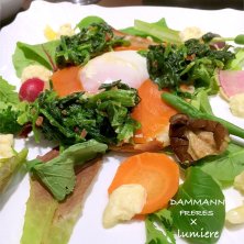 今日のおひとりさま☆ 限定10食のガレットランチ♪ (スモークサーモンと半熟卵) 午前中に用事を済ませてぷらぷら。 ここは紅茶ブランドの『ダマン・フレール』と星付きフレンチ『リュミエール』のコラボ店✨ 紅茶は煎茶にブラッドオレンジの柑橘系エッセンスとオレンジの果皮が入った“ソレイユ ヴェール”を♥ リュミエールといえば美味しいお野菜♪ ガレットがほとんど見えてないw 紅茶もガレットも美味しかったぁ(⁎˃ᴗ˂⁎)