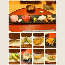 コース「唐津」。稚鮎の天ぷらが絶品。