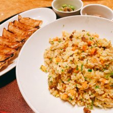 ひと口餃子ランチセット (浜木綿チャーハン 初めてのハマユー、個室お座敷掘りごたつ回るテーブル ランチセットはラーメン、坦々麺、天津飯とかから選べる 油多めの人参多めの家庭っぽいチャーハン 味のついた餃子、小さくて食べやすい、タケノコ食感 王将の並びにあるのが面白い