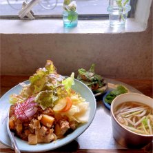 素敵な空間のカフェ circus でランチを。 茹で鳥のせごはんをいただきました♩ ついてきたスープが、おだしがしっかりでて美味しかった♡店内もとっても素敵な空間でした。