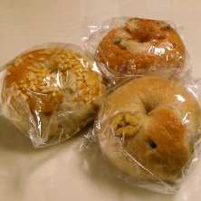 今日の戦利品♡ 大好きなベーグル屋さんのベーグルゲットヽ(*´∀`)ノ♡ 本店はちょっと遠いけど、実家近くに姉妹店があるのでゲットしてきました♡ 左のベーグルから時計回りで ごぼう醤油 ドライトマト&バジル チョコバナナ♡♡ はぁん、どれも楽しみ~(*゚∀゚)=3♡