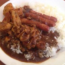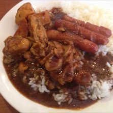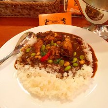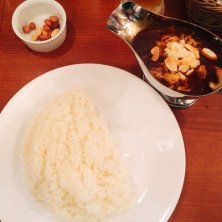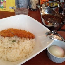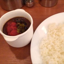 原宿。Egg'n thingsの向かいの2階。 「冷やしカレー」。 容器ごとルーが冷蔵庫で冷えてるのを、アツアツご飯にかけて食べるんです。「なんじゃそりゃ?」と思ったけど、ハラペーニョなどの辛味でまとまった味になってます。不思議。