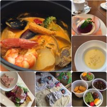 ランチセット ★オニオンスープ ★3種のオードブル ★フォアグラのポワレとビーフハンバーグステーキ 特製のデミグラスソース ★5種の魚介のスチームココット ハーブの香り ★桃のコンポートとブルガリアグラス ★チーズタルトレットのブリュレ