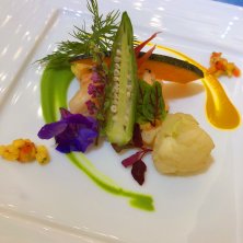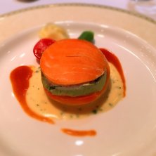 ジャガイモのエクラゼとサーモンのマリネのタルタルトマトとパインのアクセント