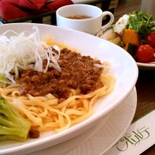 ミートソースパスタ、ポリネシアン風 食べるラー油が添えられており、要は汁なし担々麺でしたΣ(・ω・ノ)ノ お腹壊したせいで胃が小さくなったのか、食べられる量が少なくなりました(T^T)