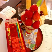 1日20食限定文房具パフェ いちごにアイスにムースにこめはぜに生クリームにクッキーに...。 お好みでコショウ! 中々、いけます! 盛りだくさんすぎて、満腹です。 お土産は、おまけ消しゴムとペンチョコ。