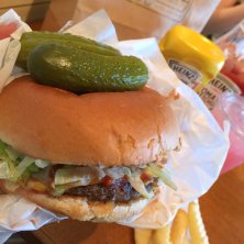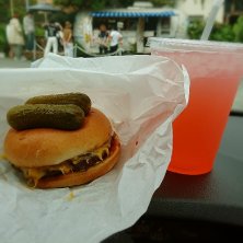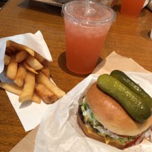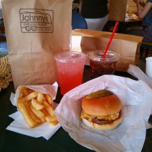 久々のジョニーさんちで毎回オーダーしてる気がするデラックスチーズバーガーをフライドポテトとピンクレモネードのセットで(⋆ʾ ˙̫̮ ʿ⋆) うーん、チーズの存在感が希薄だけどパティが肉にくしくてめちゃ旨ぁ〜\(//∇//)\