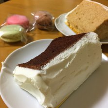 シフォンケーキ(チョコレート・シナモン) マカロン(ピスタチオ・ラズベリー・チョコ) シフォンケーキふわっふわ♡クリームもくどくなくてとっても食べやすいです(⁎˃ᴗ˂⁎)