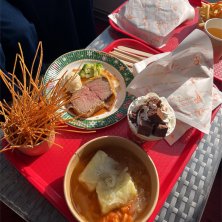 クリスマスマーケット🎄 こちらでランチ🍴😊 ロールキャベツ ローストビーフのパイ包み ホットチョコレート バタープレッツェル🥨 チーズポテト 揚げパスタ